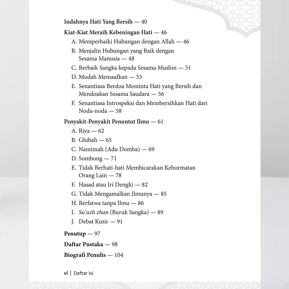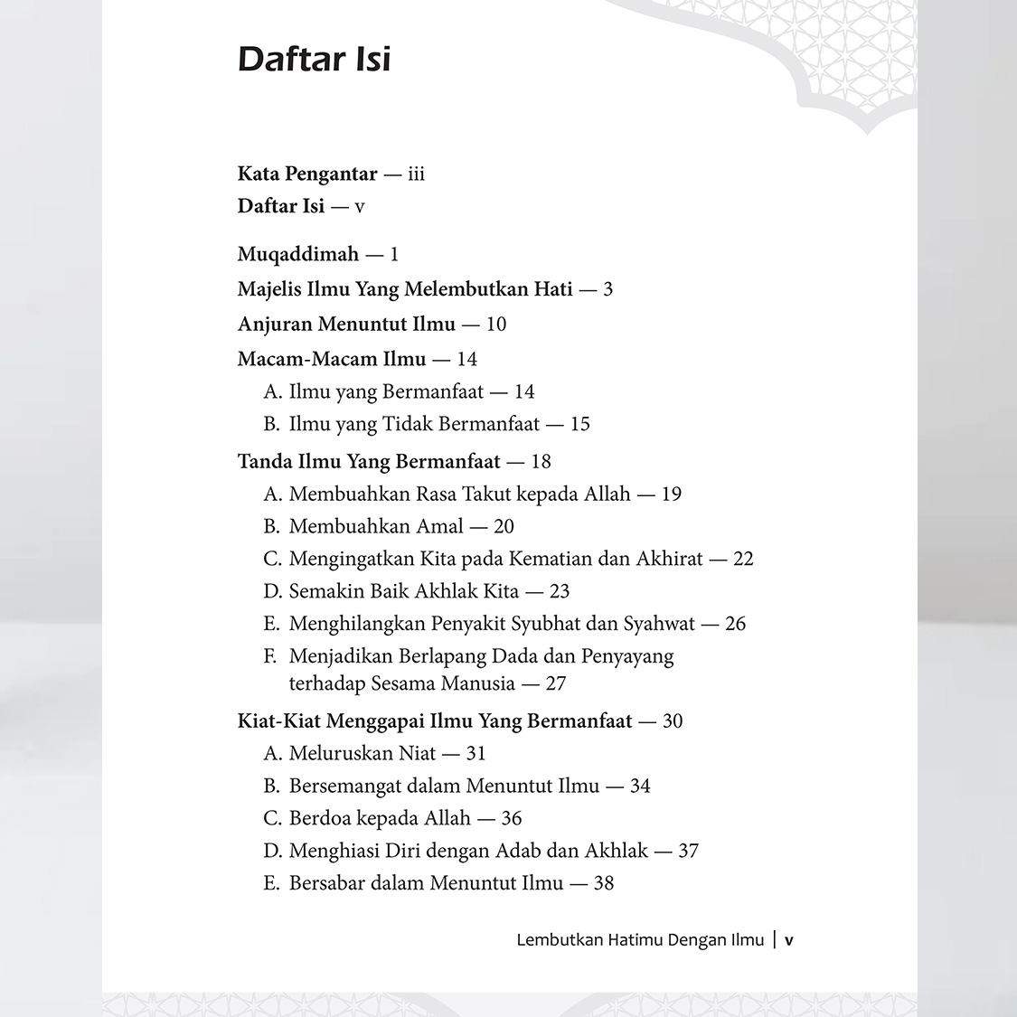 Buku ini membahas keutamaan ilmu, tanda ilmu yang bermanfaat, serta adab dan kiat meraih hati yang bening. Penulis juga mengingatkan tentang penyakit hati penuntut ilmu (sombong, riya, ujub) dan cara mengobatinya.